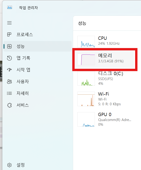 작업 관리자가 열리면 여러 탭이 보일 거예요. 메모리 정보를 확인하려면 '성능' 탭으로 이동해야 해요.