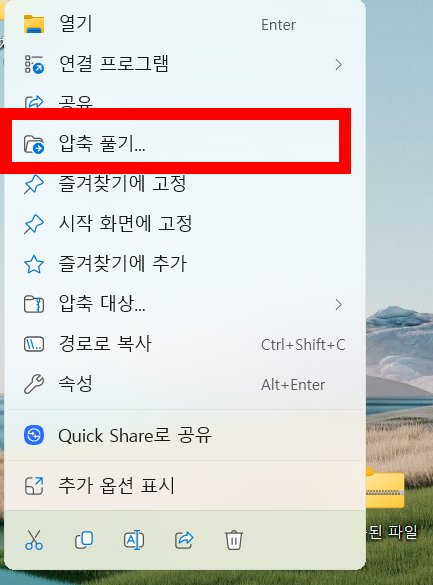 압축 파일을 선택했다면, 다시 한번 마우스 오른쪽 버튼을 눌러 메뉴를 열어볼게요.