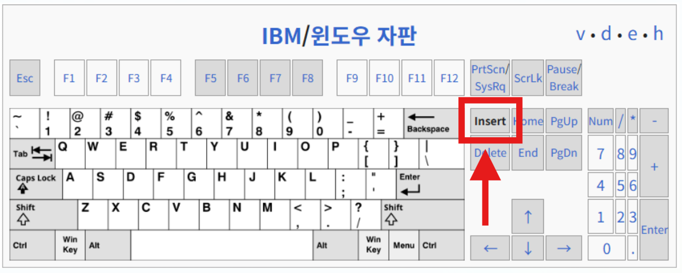 - 일반적으로 키를 한 번 누르면 겹쳐쓰기 모드와 삽입 모드가 전환됩니다